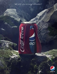 Era il 2013, quando Pepsi sfidò (per l’ennesima volta) a duello la Coca Cola con una pubblicità di Halloween intitolata: We wish you a scary Halloween. L’immagine riportava una lattina di Pepsi travestita da Coca Cola, giocando sui travestimenti spaventosi della notte delle streghe. La risposta della Coca Cola non si fece attendere, utilizzando stessa immagine e cambiando solo il copy: “Everybody wants to be a Hero”.